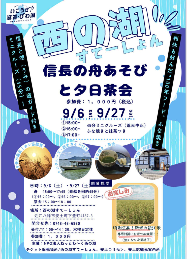 西の湖すて〜しょんでは、西の湖めぐりやカフェ事業を運営していることから、西の湖の情報発信拠点として安土城下町や歴史・文化・景観を発信していくことを目的に安土城築城450年事業に合わせて、地域住民の参画や次世代への魅力発信事業を実施します。