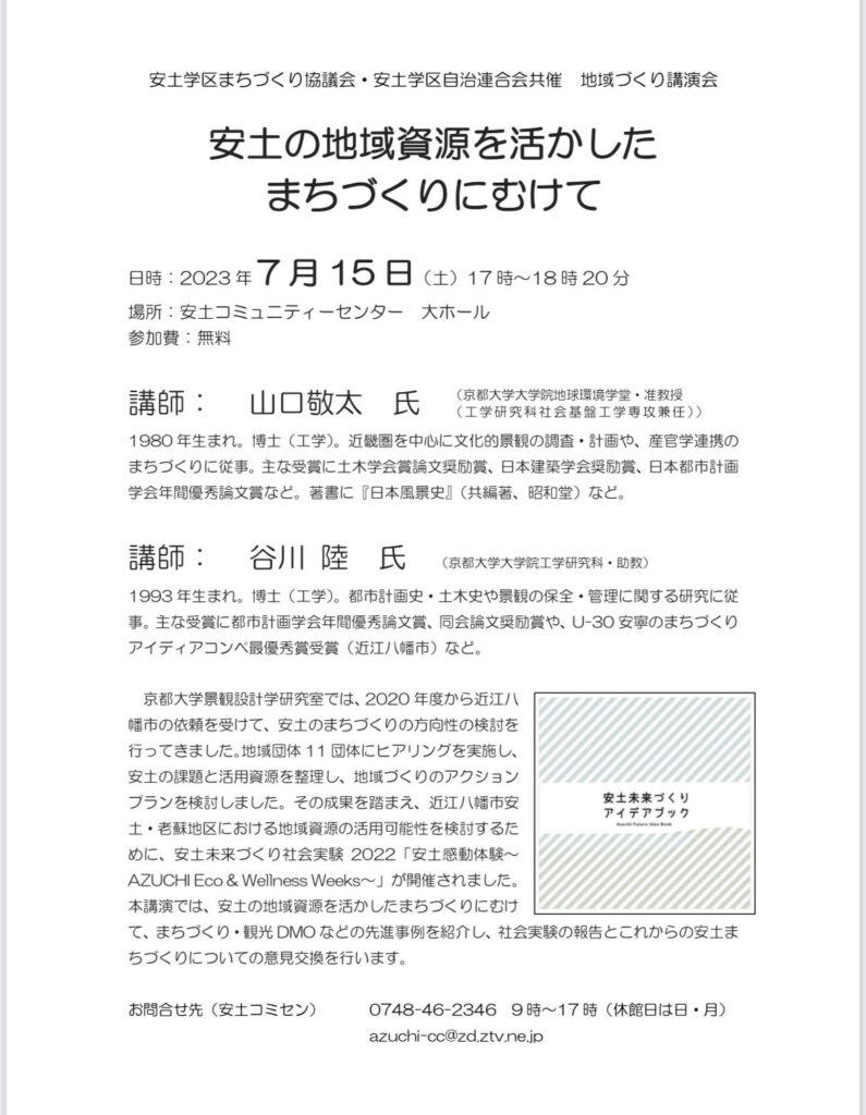 京都大学景観設計学設計室の山口准教授と学生さんたちは近江八幡市の依頼を受け、2020年から安土のまちづくりの方向性を探るべく、継続して課題の抽出と解決に向けての検討を行ってこられました。