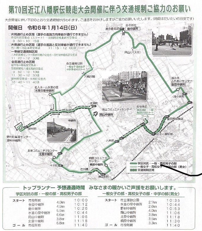 第70回記念近江八幡駅伝競走大会 2024年1月12日 最終更新日時 : 2024年1月12日 nishinokocalendar イベント詳細 日付: 2024年1月14日 9:50 AM – 12:30 PM カテゴリ: たのしむ 今大会で70回目の節目を迎える「近江八幡駅伝競走大会」を令和6年1月14日(日曜日)に開催します。 西の湖周辺は駅伝ルートではありませんが、当日は近江八幡市内のあちこちで交通規制などありますので、お出かけの際はご注意ください。